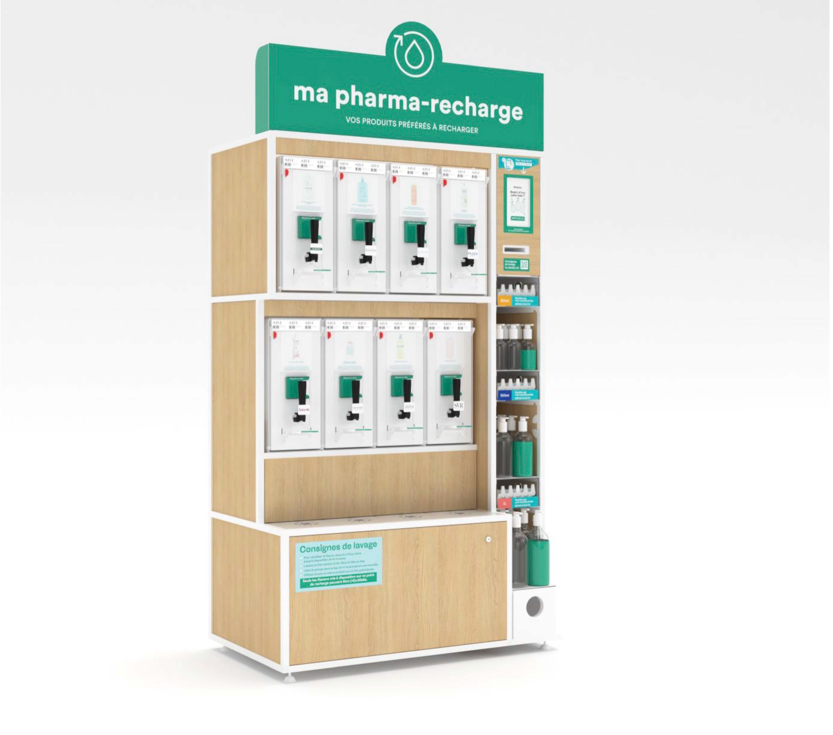 Launched in 2023 by a consortium of French dermocosmetic brands (Garancia, Bioderma, Pierre Fabre, La Rosée, Mustela). Pharma-Recharge installs refill fountains in pharmacies for multi-brand products such as shampoos, shower gels, and micellar waters.