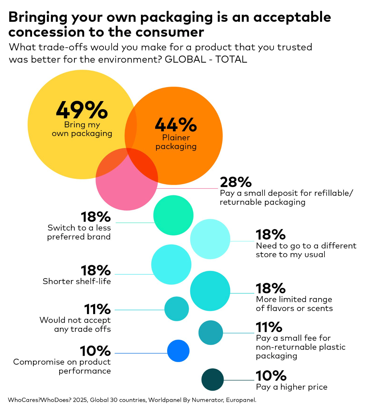 Most people are open to some compromise for greener choices, but not when it comes to price. Only 10% would be willing to pay more for sustainability. The sweet spot lies in “win-win” solutions that save money and reduce impact, such as bringing your own packaging (already adopted by half of global consumers) or deposit-return schemes that reward recycling.