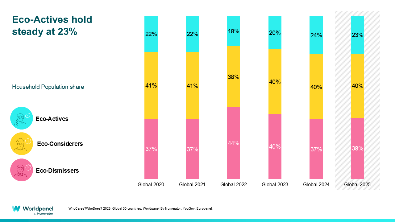 The report tracks the global proportion of these segments, showing that in 2025, Eco-Actives hold steady at 23% (a slight 1% drop from previous years), Eco-Considerers are static at 40%, and Eco-Dismissers have risen to 38%.