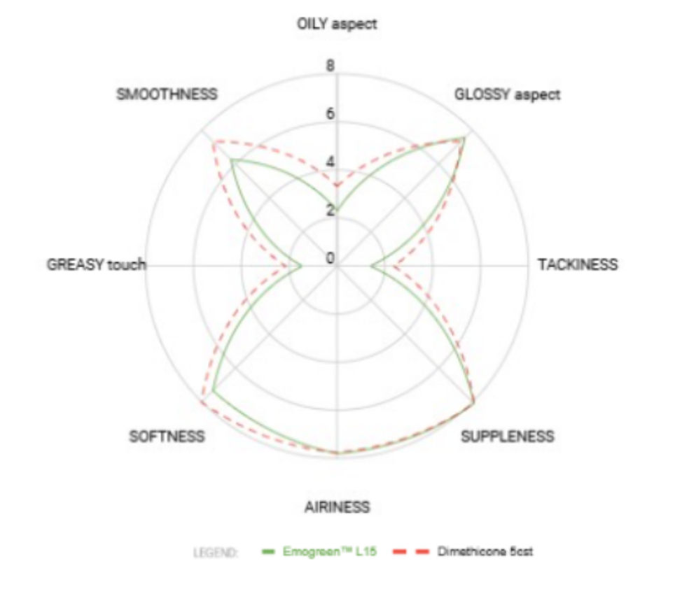 A comparative sensorial analysis with an expert panel demonstrates sensorial correspondence between silicone oils usually used in hair care products and each Emogreen grade. For example, a sensorial analysis of a cream-gel on non-damaged long hair tresses, has demonstrated that Emogreen L15 offers similar experience to Dimethicone 5cst with less greasiness and tackiness on the hair fiber which makes it a real solution for formulators also looking to replace volatile cyclic silicones (D5, D6).