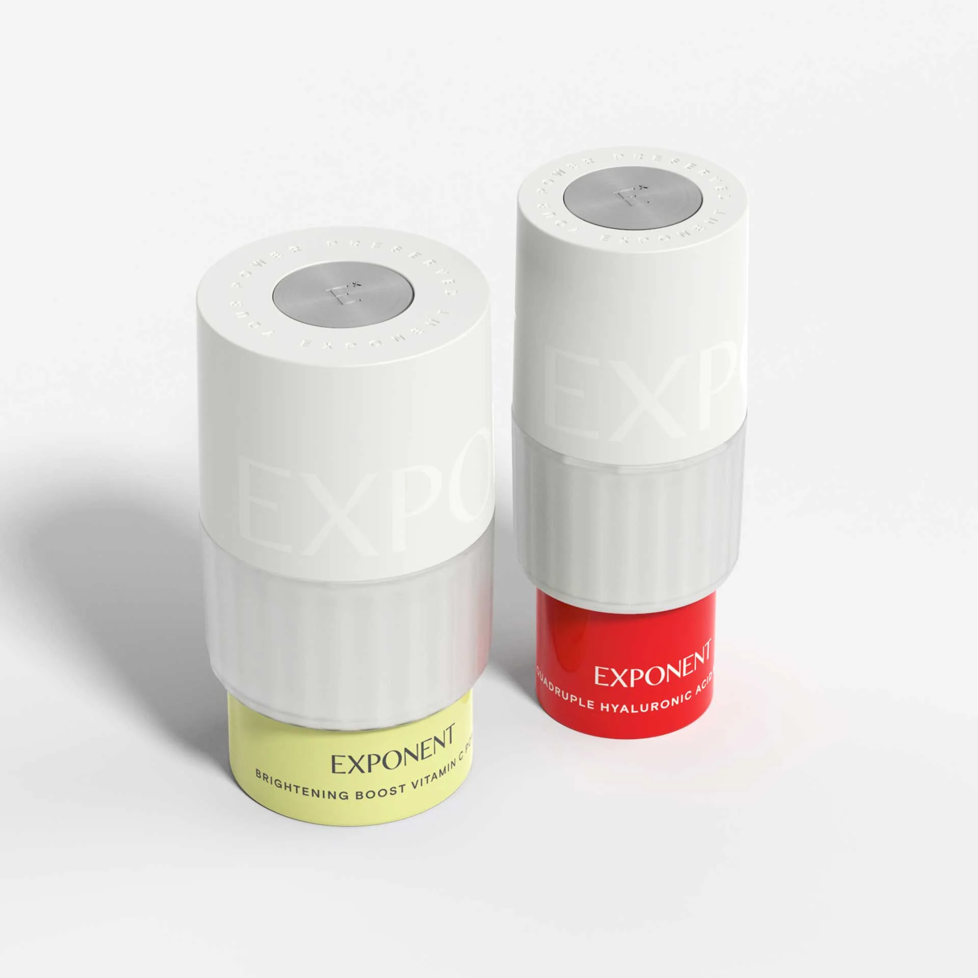 Examples include Exponent in the US - a self-activated clinical-grade skincare - where active ingredients are kept at maximum potency in a powder format that is activated just before application with a hyaluronic acid serum. The refillable cartridge is made of glass, and both pumps can be used infinitely for the powder or the serum.